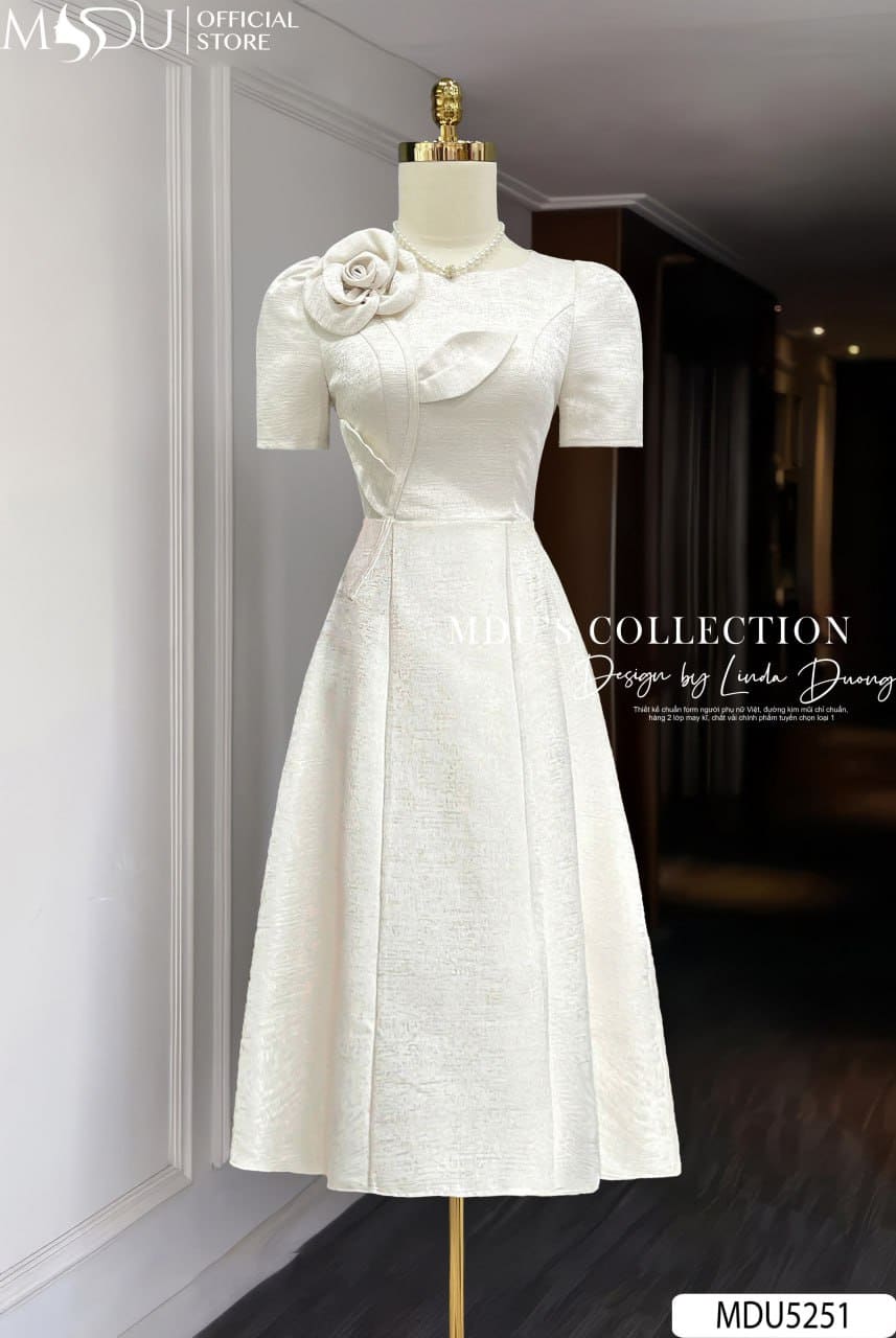 Thiết kế cổ tròn kín mang lại vẻ thanh lịch chuẩn mực, tay ngắn ôm vừa phải giúp cân bằng tỷ lệ cơ thể. Điểm nhấn nổi bật của MDU5251 chính là bông hoa 3D lớn đặt tinh tế trên vai, kết hợp cùng đường cắt may uốn lượn trước ngực, tạo chiều sâu thị giác và sự duyên dáng độc đáo. Mỗi chi tiết đều được chăm chút kỹ lưỡng, khẳng định đẳng cấp thời trang cao cấp.