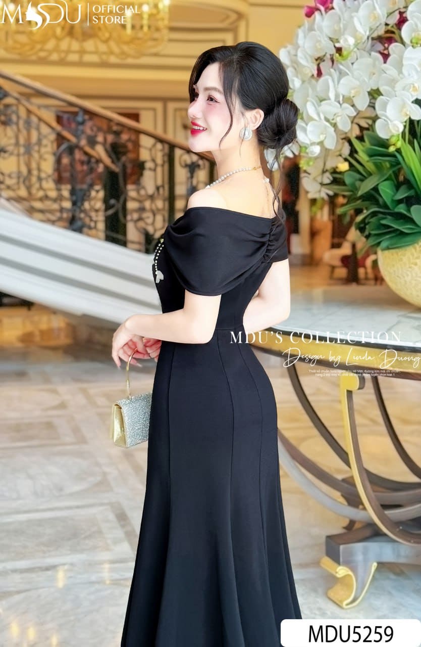 Váy Thiết Kế MDU5259 Đầm Xleo Đen Dài Ôm Nhẹ Phối Lưới Trong Suốt Đính Hoa Ngọc Sang Trọng