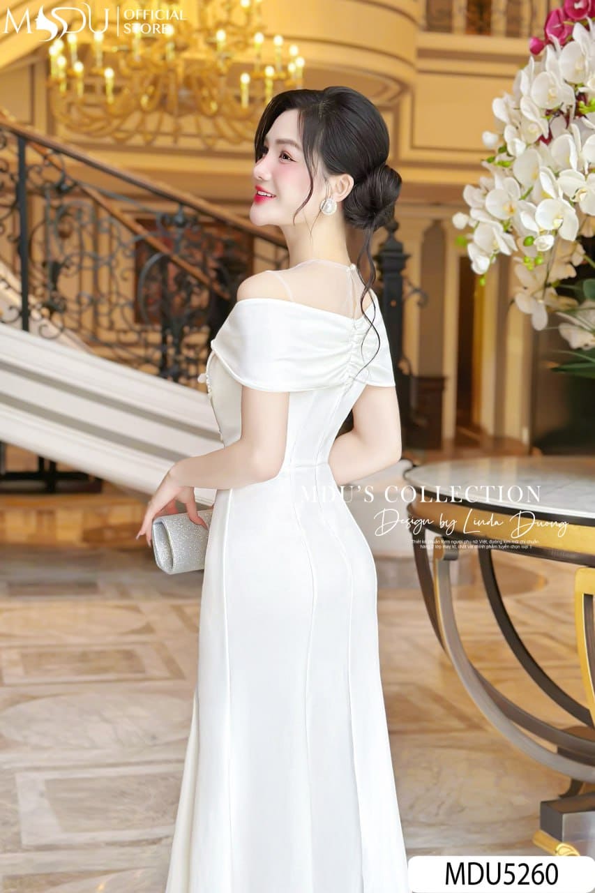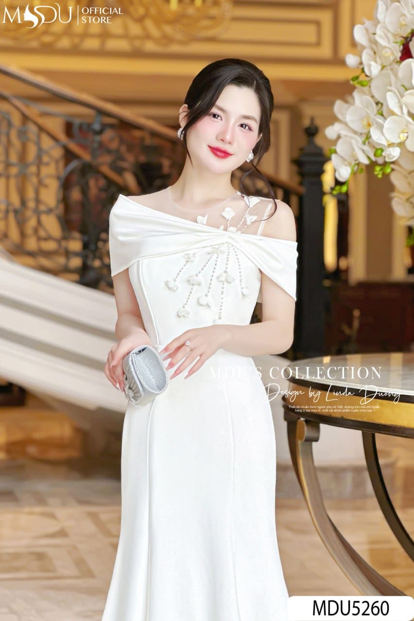 Váy Thiết Kế MDU5260 Đầm Xleo Trắng Lệch Vai Phối Lưới Hoa Trang Trí Thanh Lịch Và Quý Phái