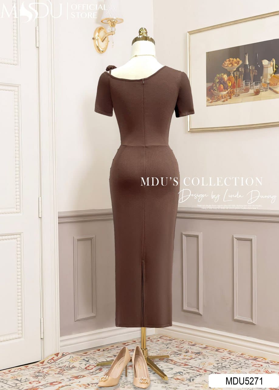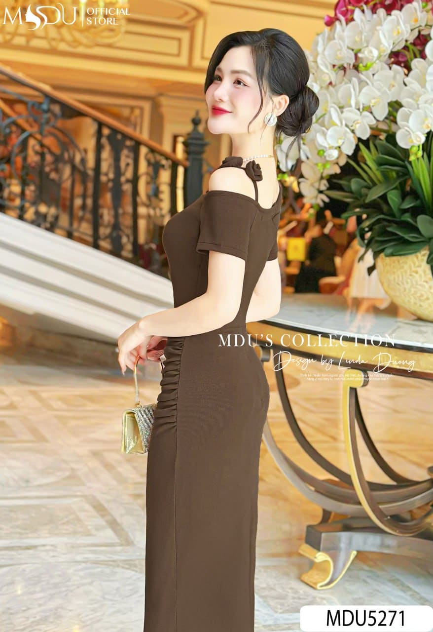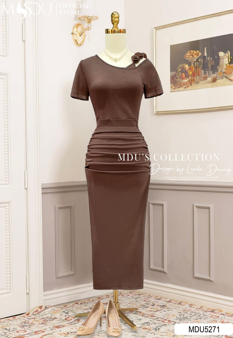 Váy Thiết Kế MDU5271 Borip Nâu Cà Phê Ôm Dài Qua Gối Xếp Ly Eo Lệch Vai Hoa Vai Thanh Lịch