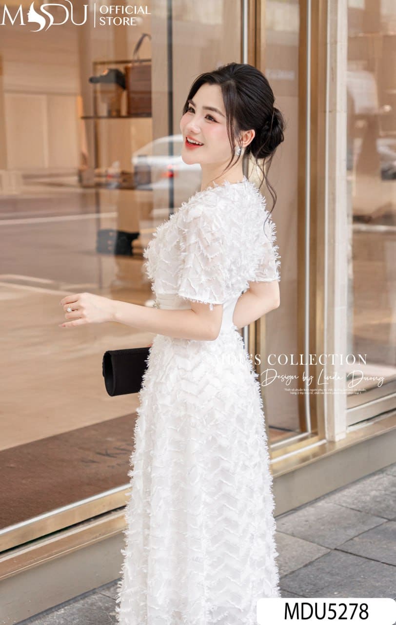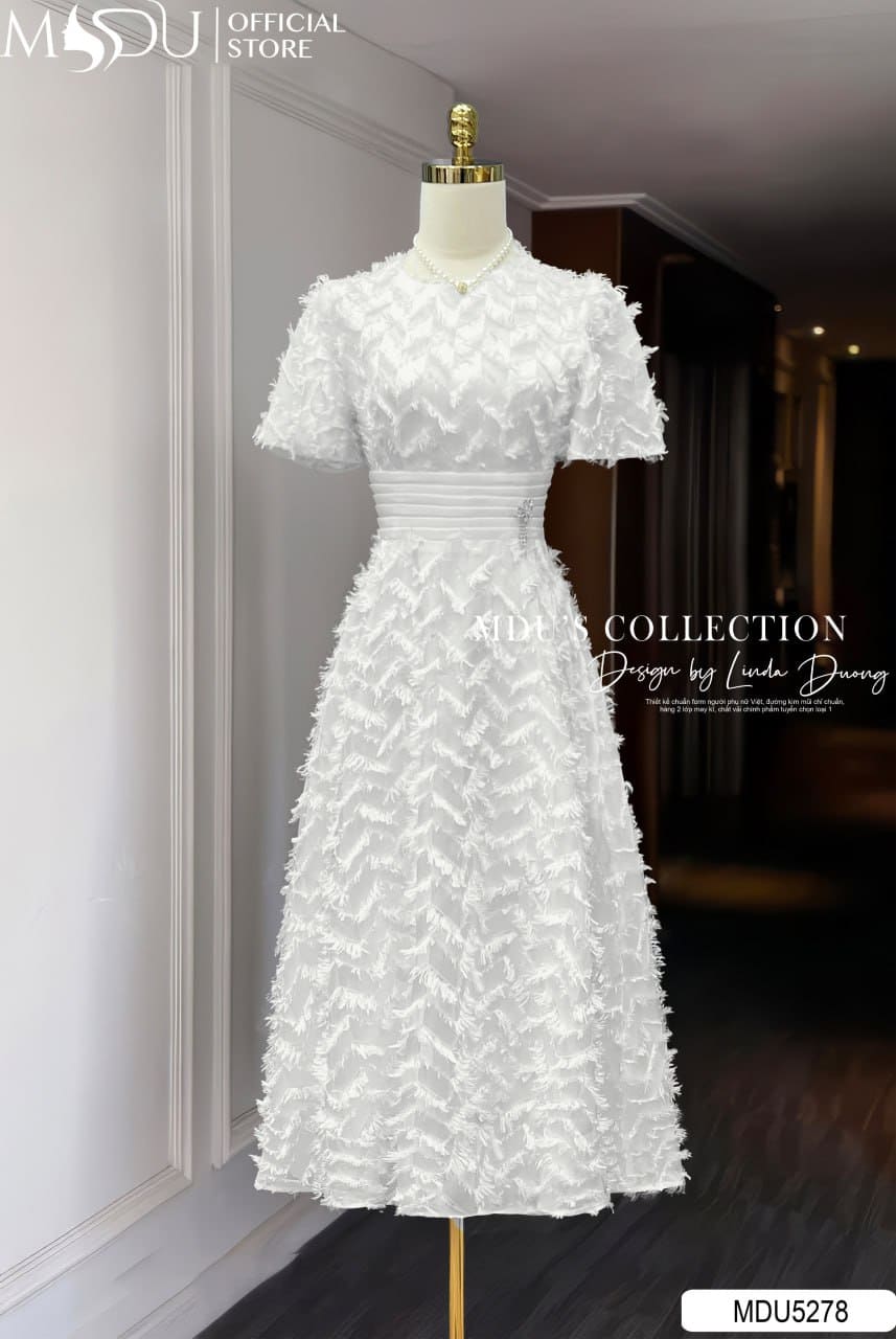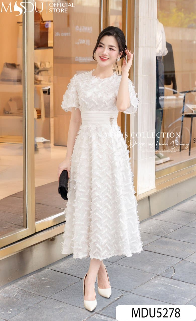Váy Thiết Kế MDU5278 Lụa Dệt Họa Tiết Gam Trắng Tinh Khôi Thanh Lịch Và Cuốn Hút
