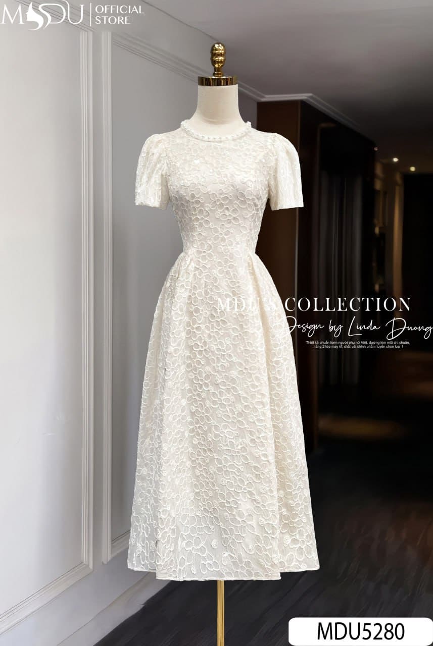 Váy Thiết Kế MDU5280 Ren Thêu Hoa Trắng Ngà Dáng Dài Qua Gối Thanh Lịch Và Nữ Tính