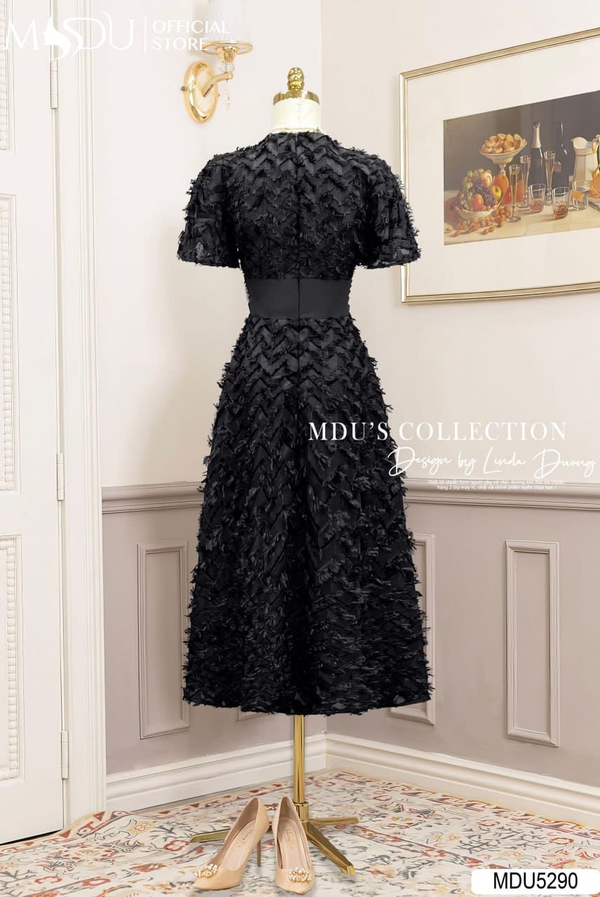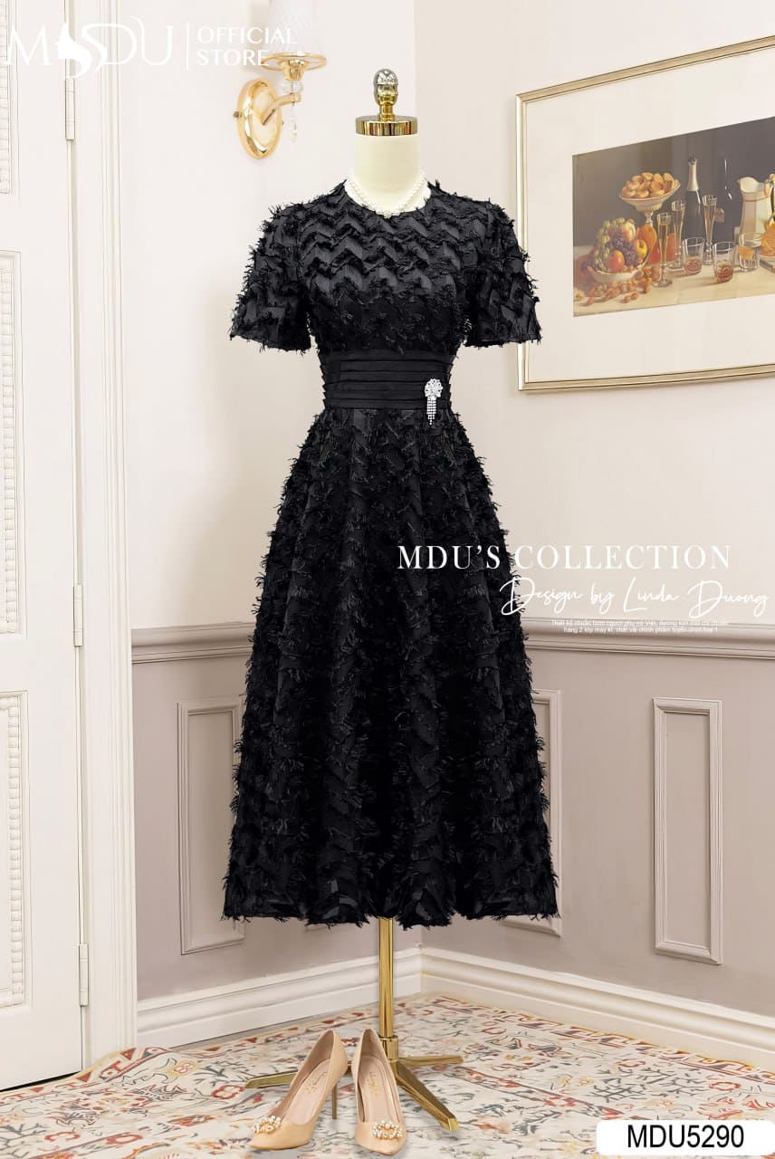 Váy Thiết Kế MDU5290 Lụa Dệt Họa Tiết Đen Huyền Bí Dáng Dài Xòe Nhẹ Quý Phái Và Cuốn Hút