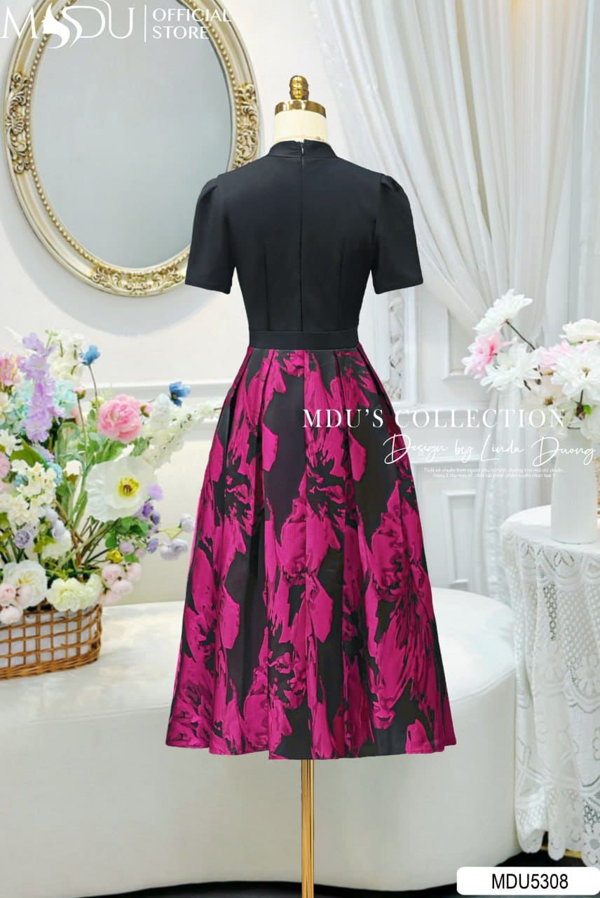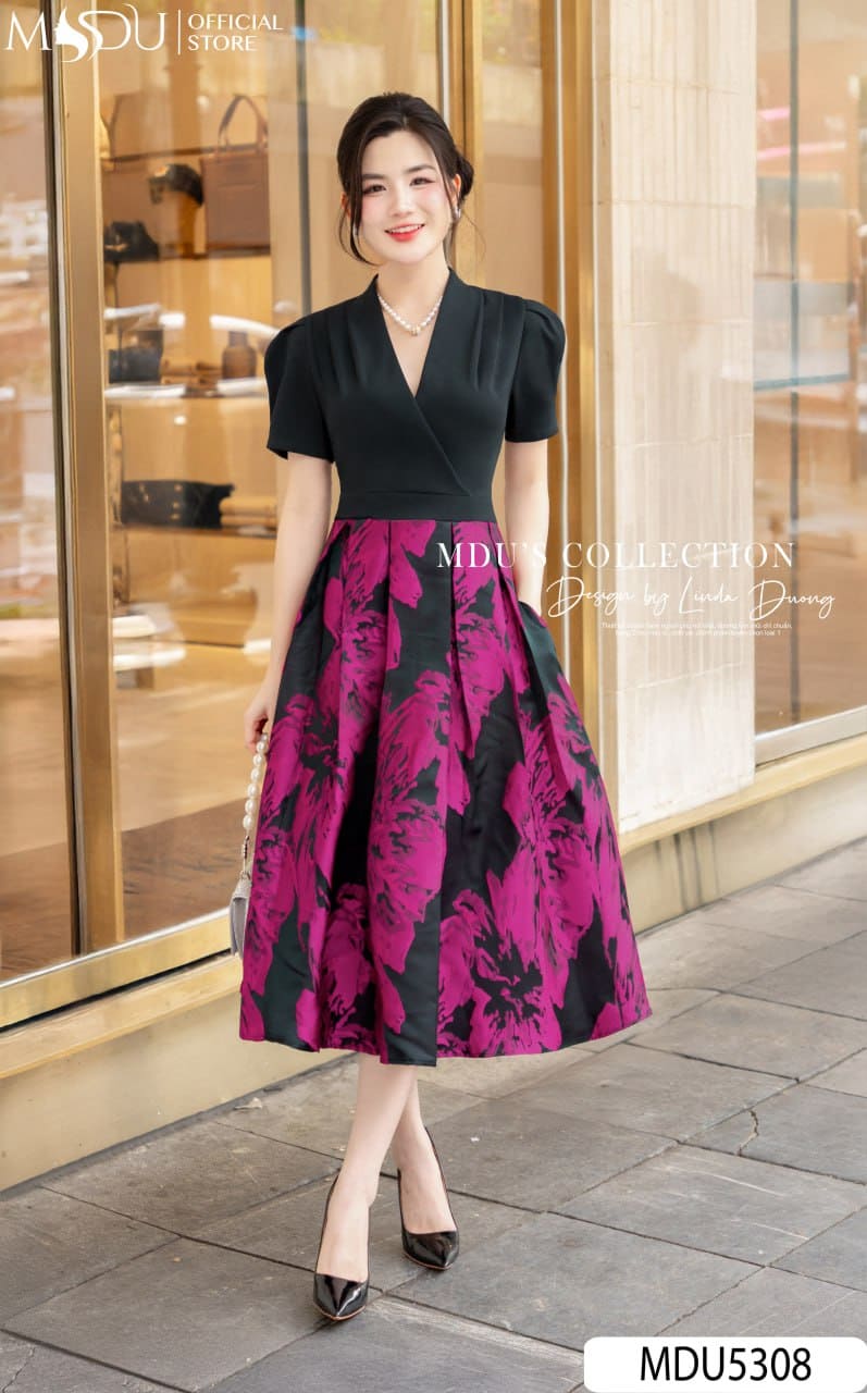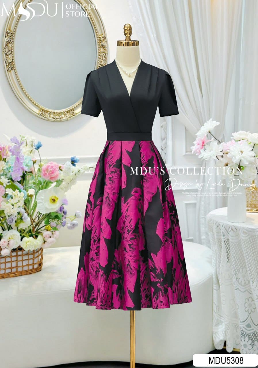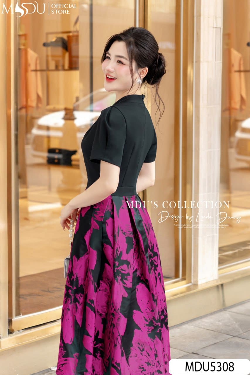 MDU Fashion hân hạnh giới thiệu thiết kế MDU5308 – một tuyệt phẩm tôn vinh sự giao hòa giữa nét hiện đại và vẻ đẹp cổ điển. Phần áo được may từ chất liệu Xleo co giãn sắc đen sang trọng, ôm nhẹ nhàng theo đường cong, cùng cổ chữ V bắt chéo tinh tế và tay phồng nhẹ nữ tính. Chân váy làm từ gấm cao cấp nổi bật với họa tiết hoa loang bản lớn sắc hồng tím trên nền đen, tạo nên hiệu ứng thị giác cuốn hút, mang lại nét sang trọng đầy nghệ thuật.