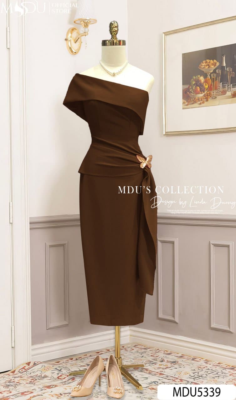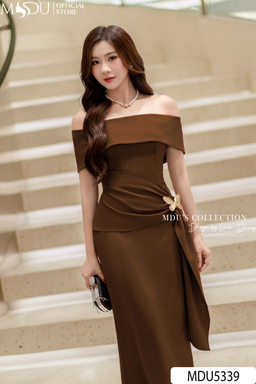 Váy Thiết Kế MDU5339 Xleo Hàn Cao Cấp Dáng Ôm Dài Quá Gối Cổ Bardot Trễ Vai Socola Trầm Đắp Vạt Lệch Eo Điểm Nhấn Bướm Ánh Kim