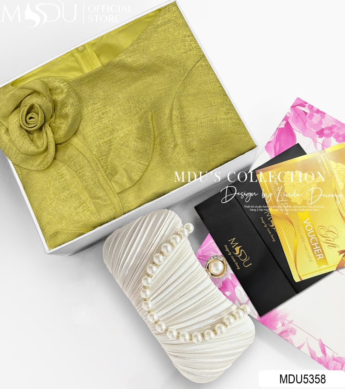 Với sắc vàng cốm tươi sáng và chất liệu cao cấp, MDU5358 là lựa chọn lý tưởng cho các buổi tiệc, sự kiện quan trọng hay những buổi chụp hình cần sự nổi bật. Thiết kế này như một khúc ca ca ngợi nét đẹp hiện đại của người phụ nữ – thanh lịch, duyên dáng và luôn tỏa sáng trong mọi khoảnh khắc.