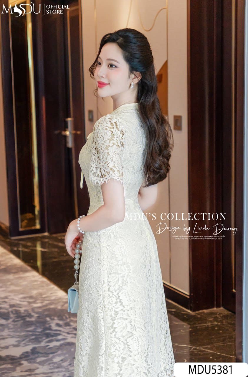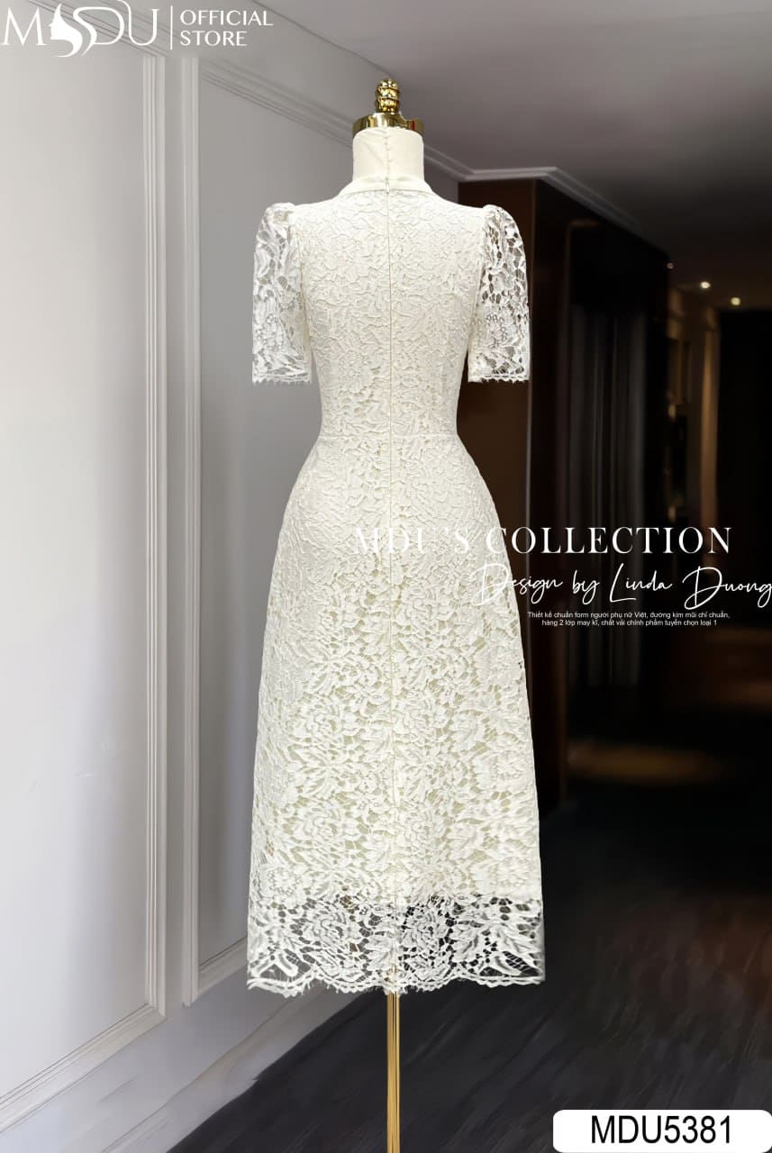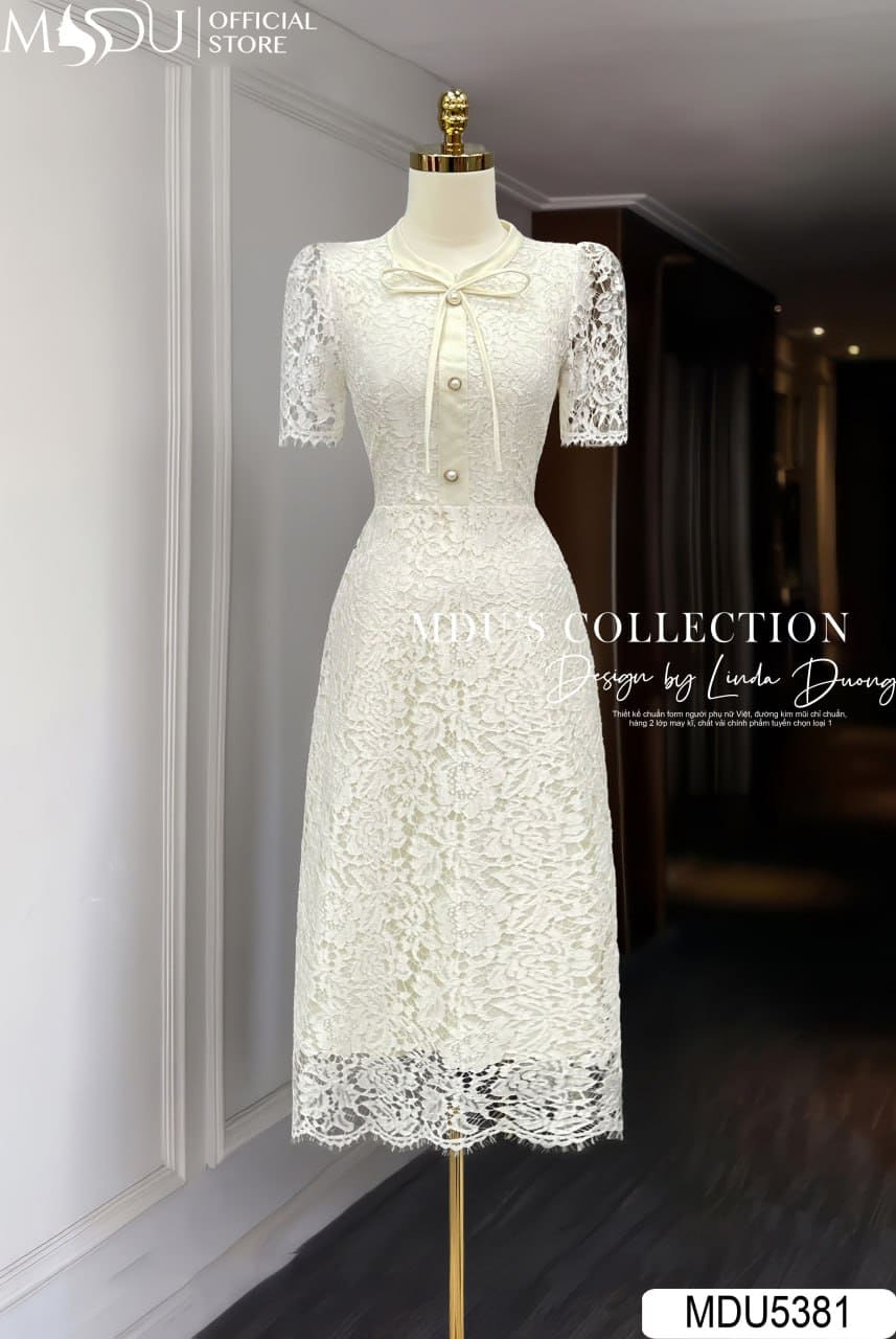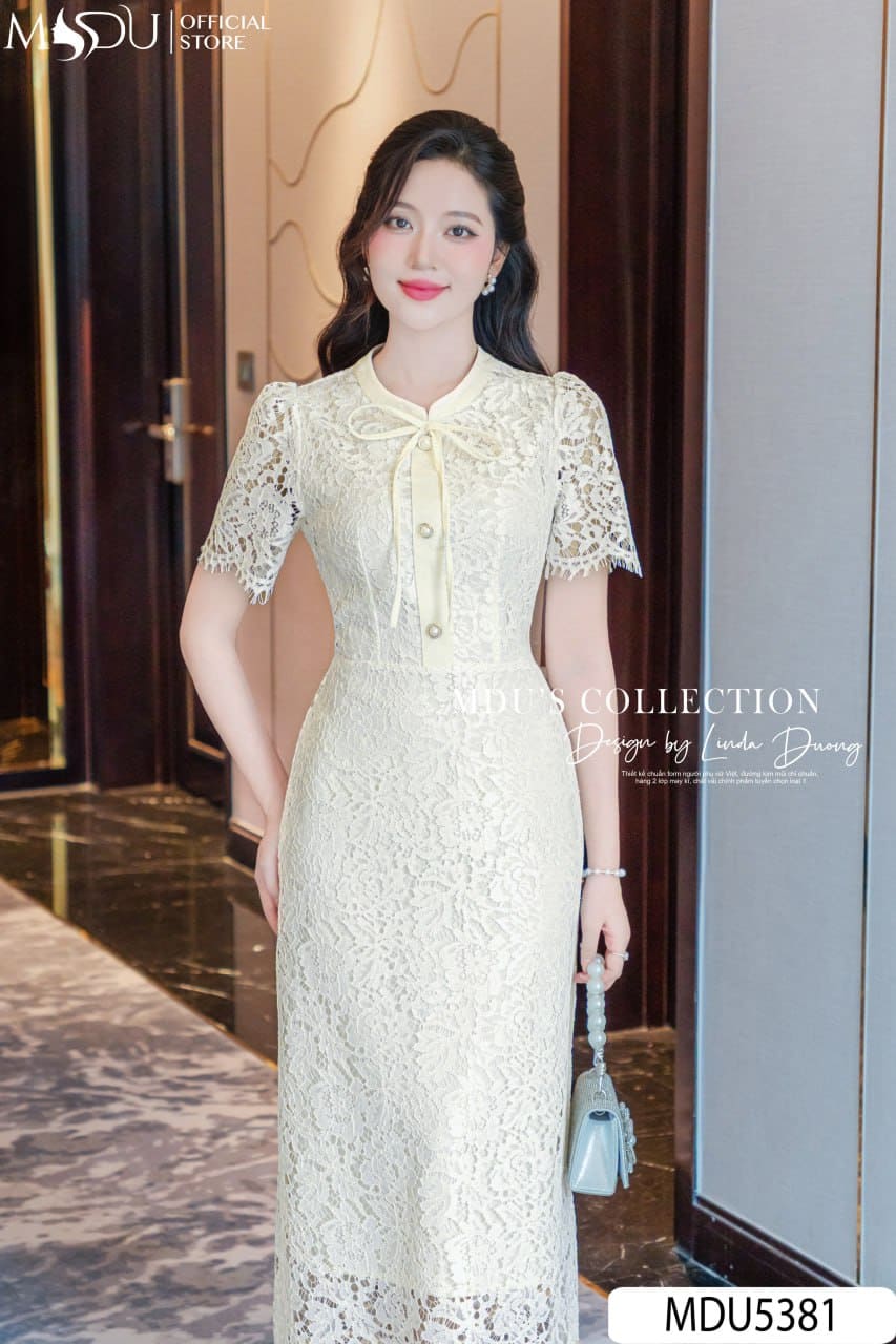 Váy Thiết Kế MDU5381 Ren Dệt Họa Tiết Cao Cấp Dáng Ôm Body Nơ Phối Cổ Thanh Lịch Và Quyến Rũ