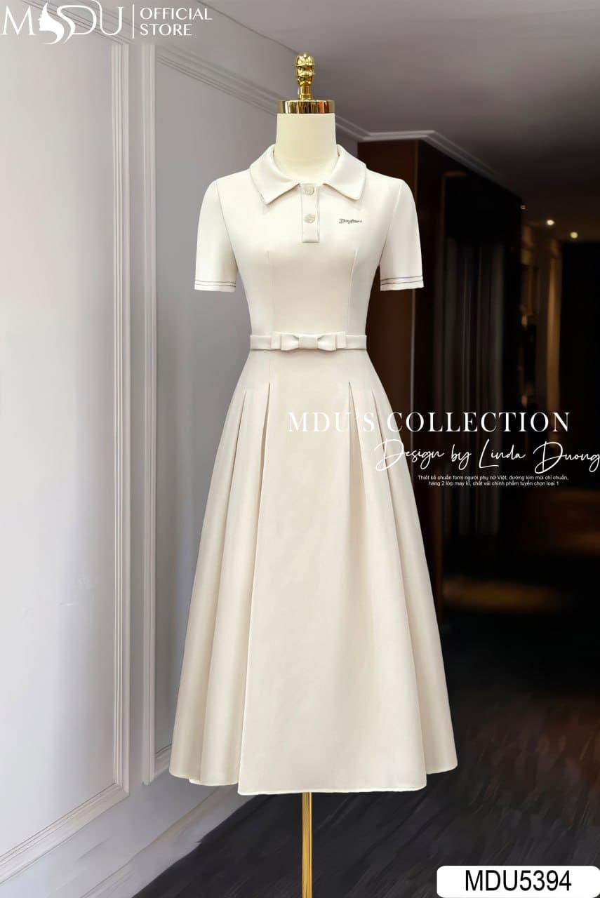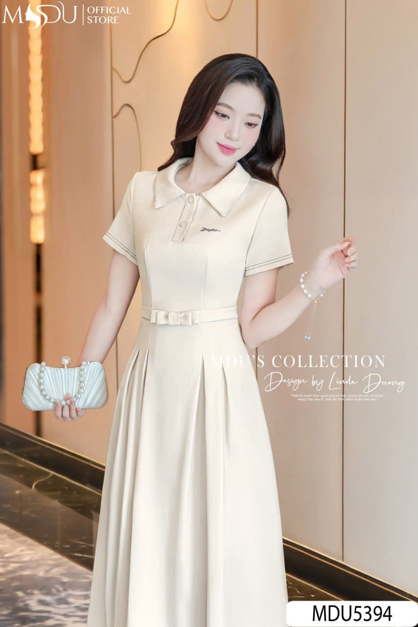 Váy Thiết Kế MDU5394 Gold Nhật Cao Cấp Dáng Xòe Midi Cổ Polo Lịch Sự Và Quý Phái