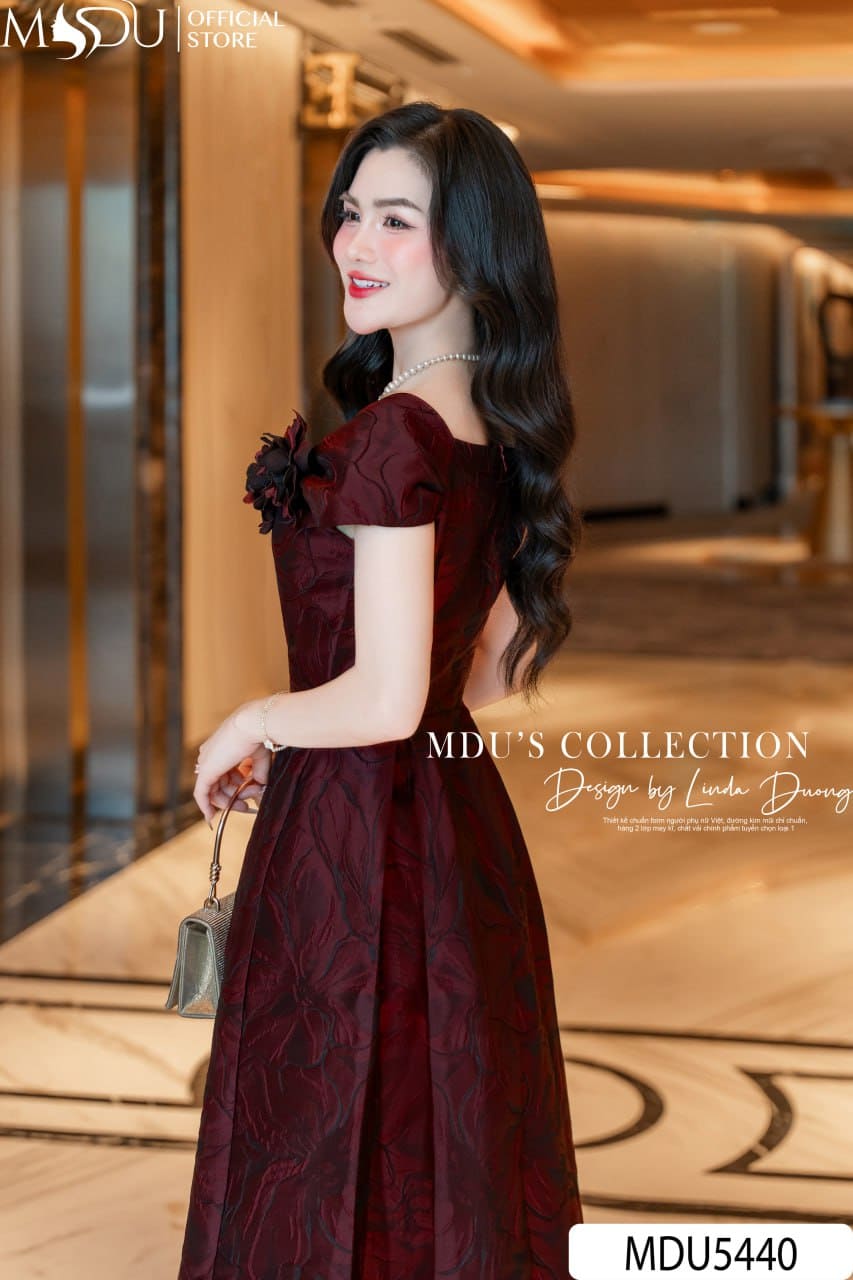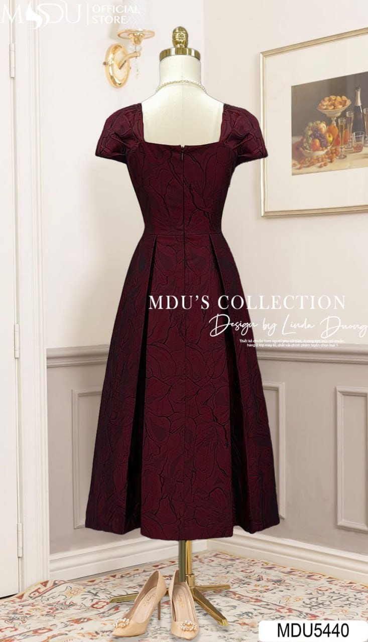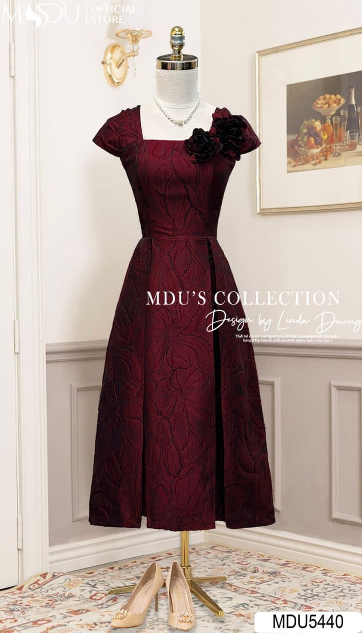 Váy Thiết Kế MDU5440 Gấm Vân Nổi Đỏ Đô Dáng Xòe Midi Cổ Vuông Hoa Vai Thanh Lịch Và Đẳng Cấp