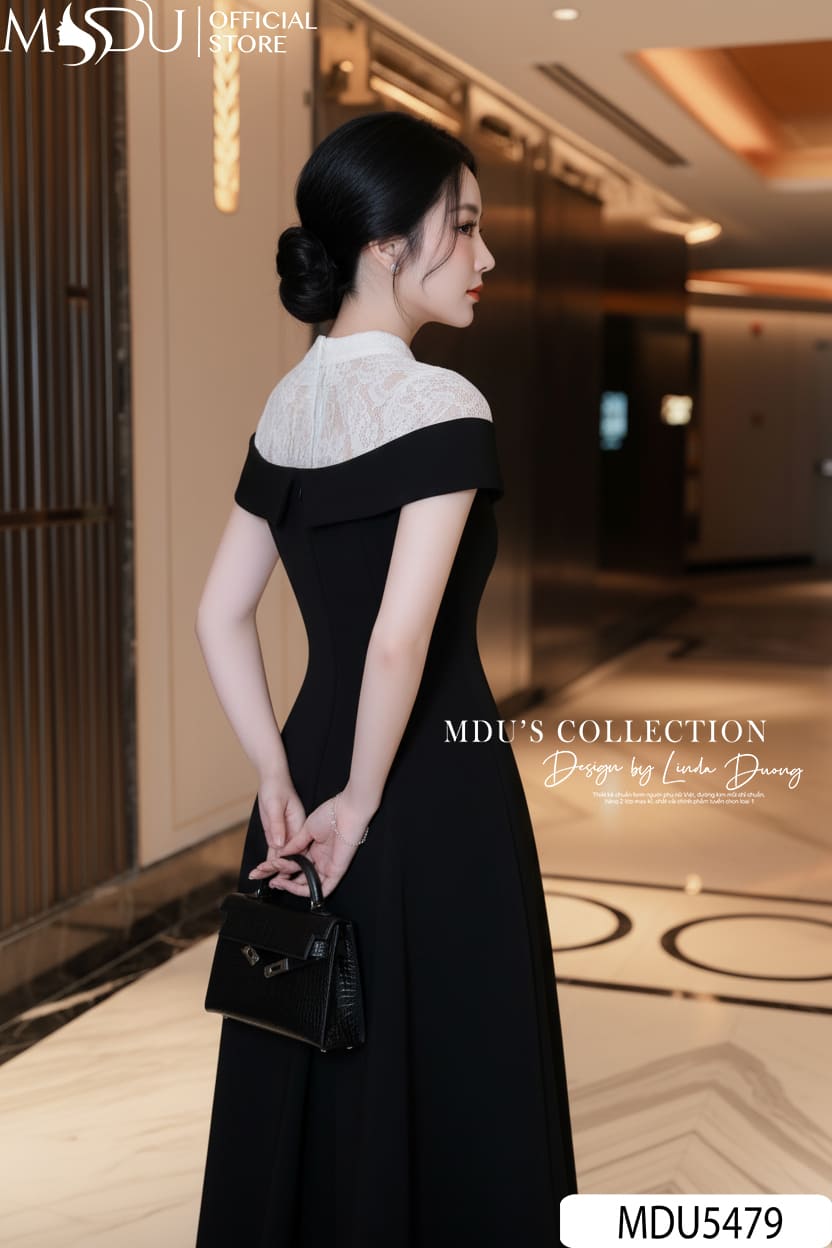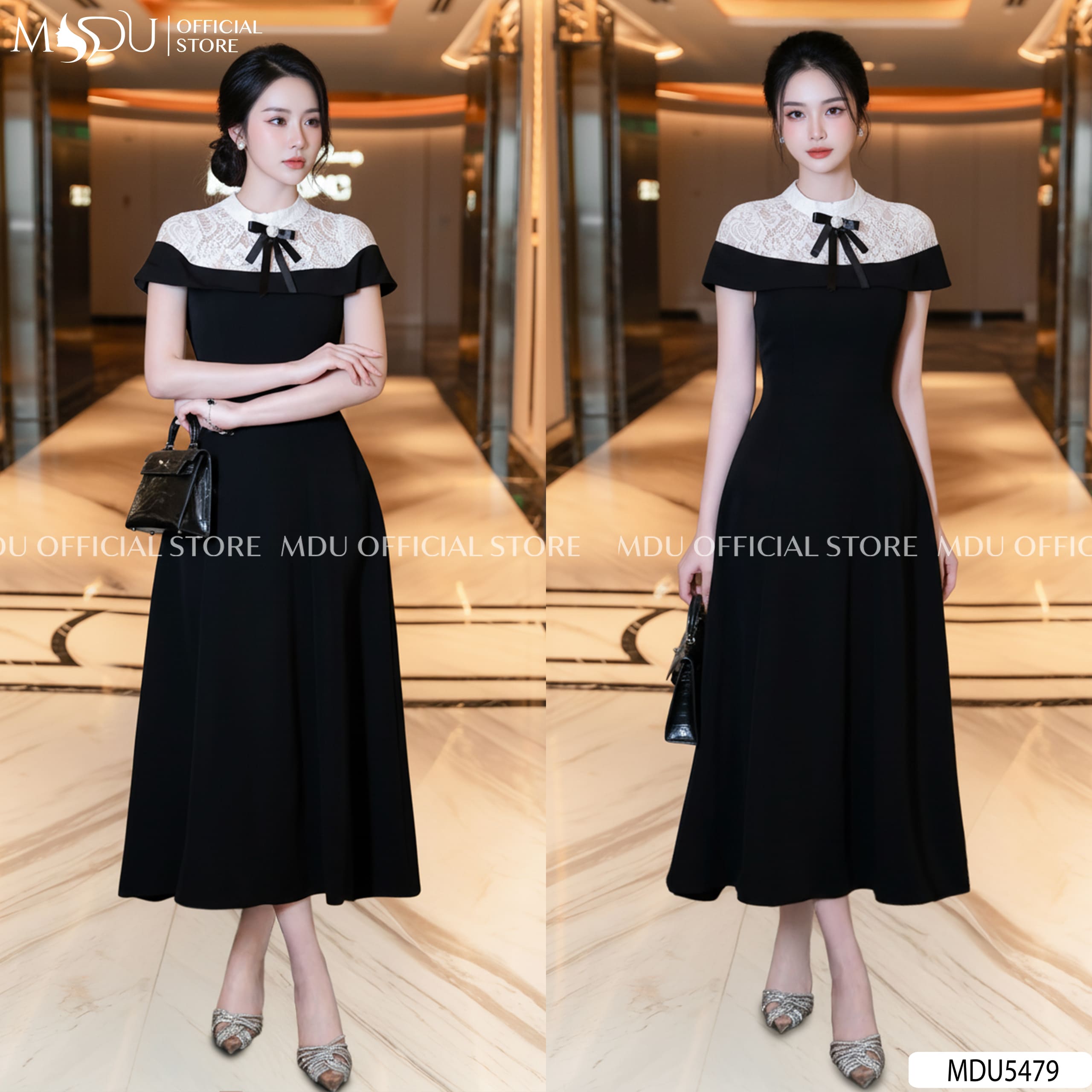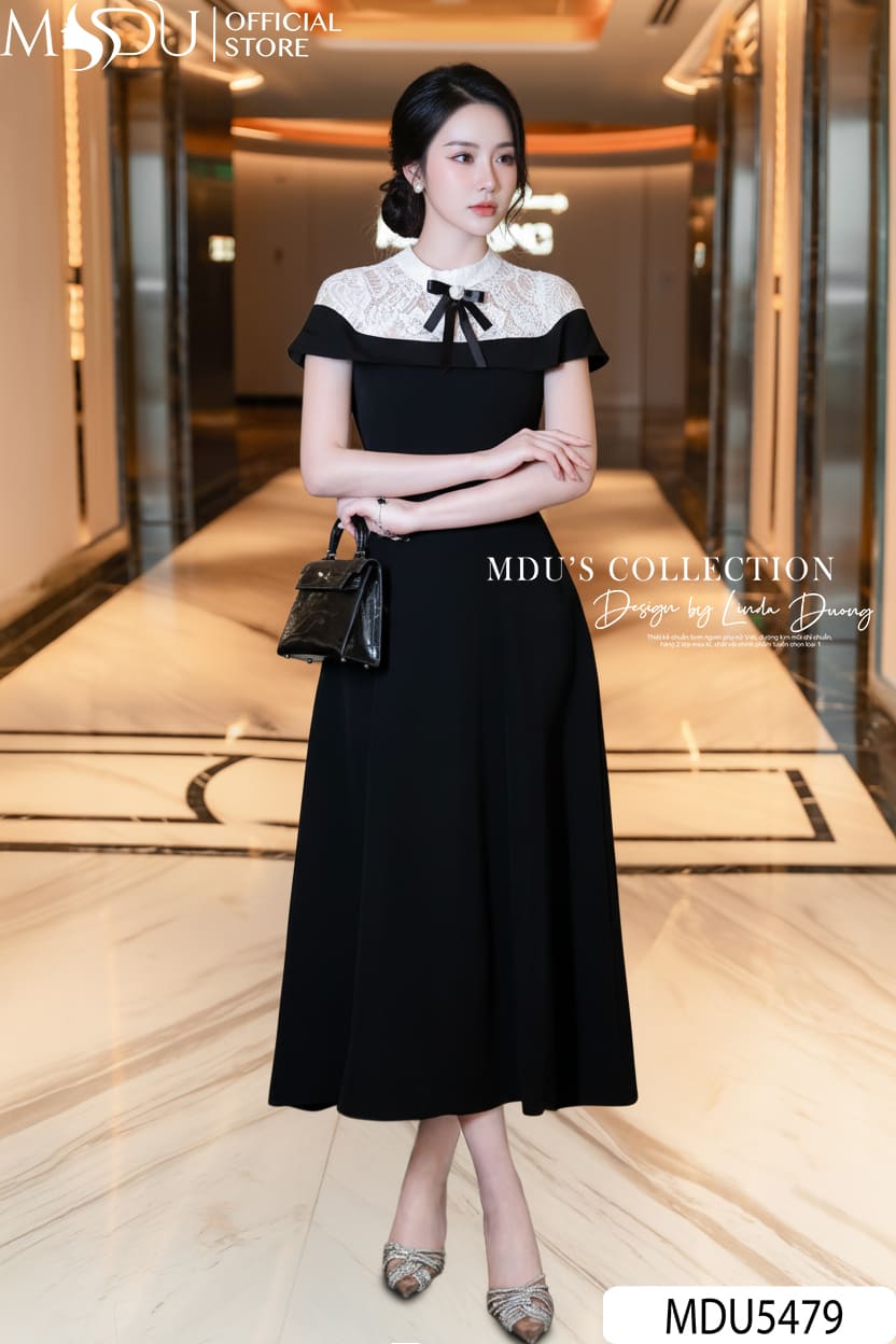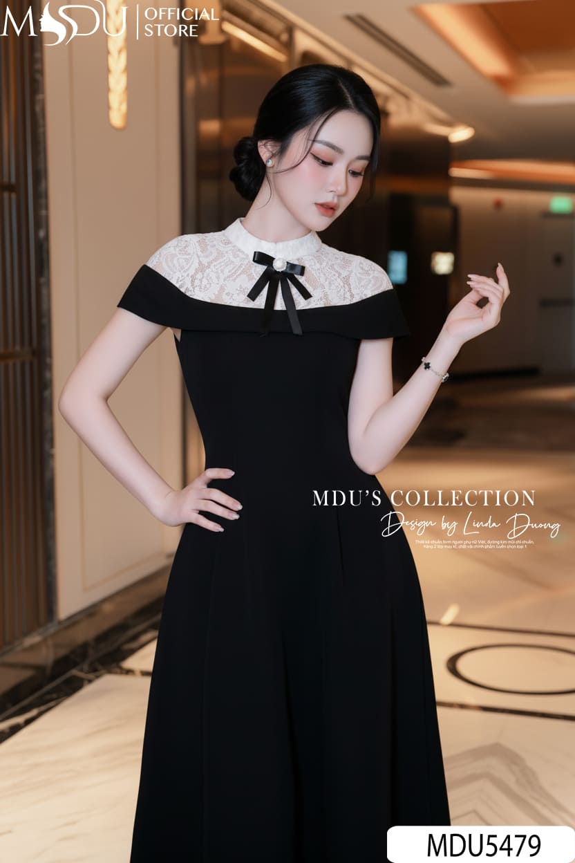 Thiết kế dáng suông xòe nhẹ giúp MDU5479 phù hợp với nhiều vóc dáng khác nhau, khéo léo tôn lên vẻ đẹp tự nhiên mà không gò bó. Phần vai phối ren nổi bật tạo hiệu ứng nhẹ nhàng, giúp bộ trang phục trở nên tinh tế và thu hút hơn. Mỗi đường cắt may được thực hiện cẩn trọng để đảm bảo form váy ôm nhẹ phần thân trên và buông mềm phần chân váy, mang đến sự cân đối hài hòa cho tổng thể.