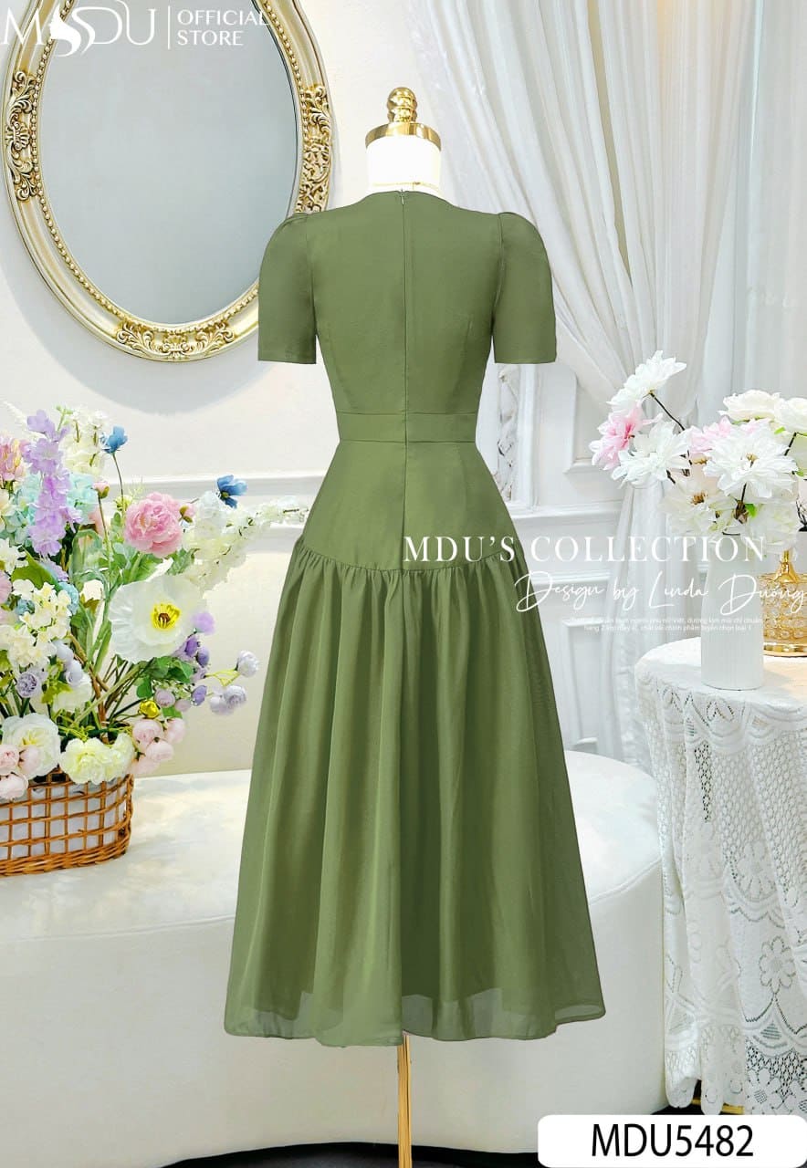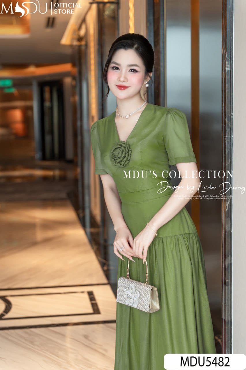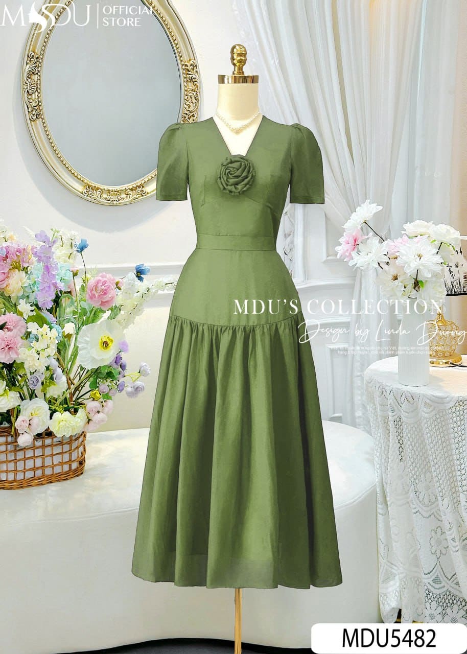 Váy Thiết Kế MDU5482 Tơ Óng Hàn Cao Cấp Dáng Xòe Dài Cổ V Hoa 3D Thanh Lịch Và Cuốn Hút