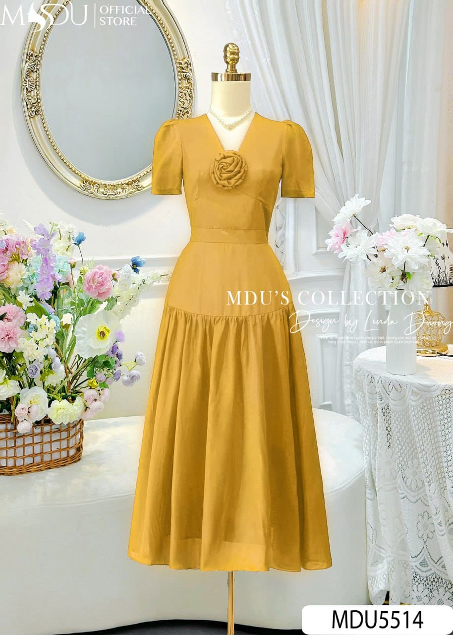 Váy Thiết Kế MDU5514 Tơ Óng Hàn Cao Cấp Dáng Xòe Midi Cổ V Tay Phồng Hoa 3D Quý Phái