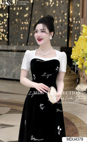 Váy Thiết Kế MDU4379 – Dáng Chữ A Phối Gam Màu Trắng Và Đen Tinh Tế Cùng Họa Tiết Bắt Mắt