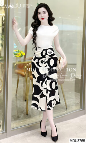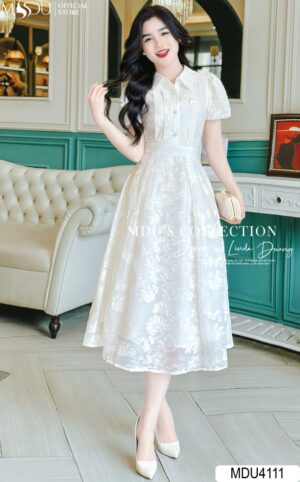 Váy Thiết Kế MDU4136 Cổ V Tông Vàng Pha Hoạ Tiết 5D – Dáng Xòe Tiểu Thư Thanh Lịch Tinh Tế