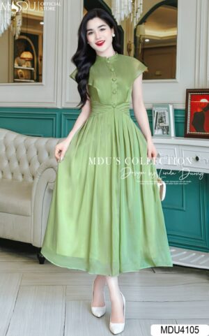 Váy Thiết Kế MDU4105 Tơ Óng Hàn Gam Xanh Rêu Dáng Xoè Nhẹ Tay Cánh Tiên Tiểu Thư Và Thanh Lịch
